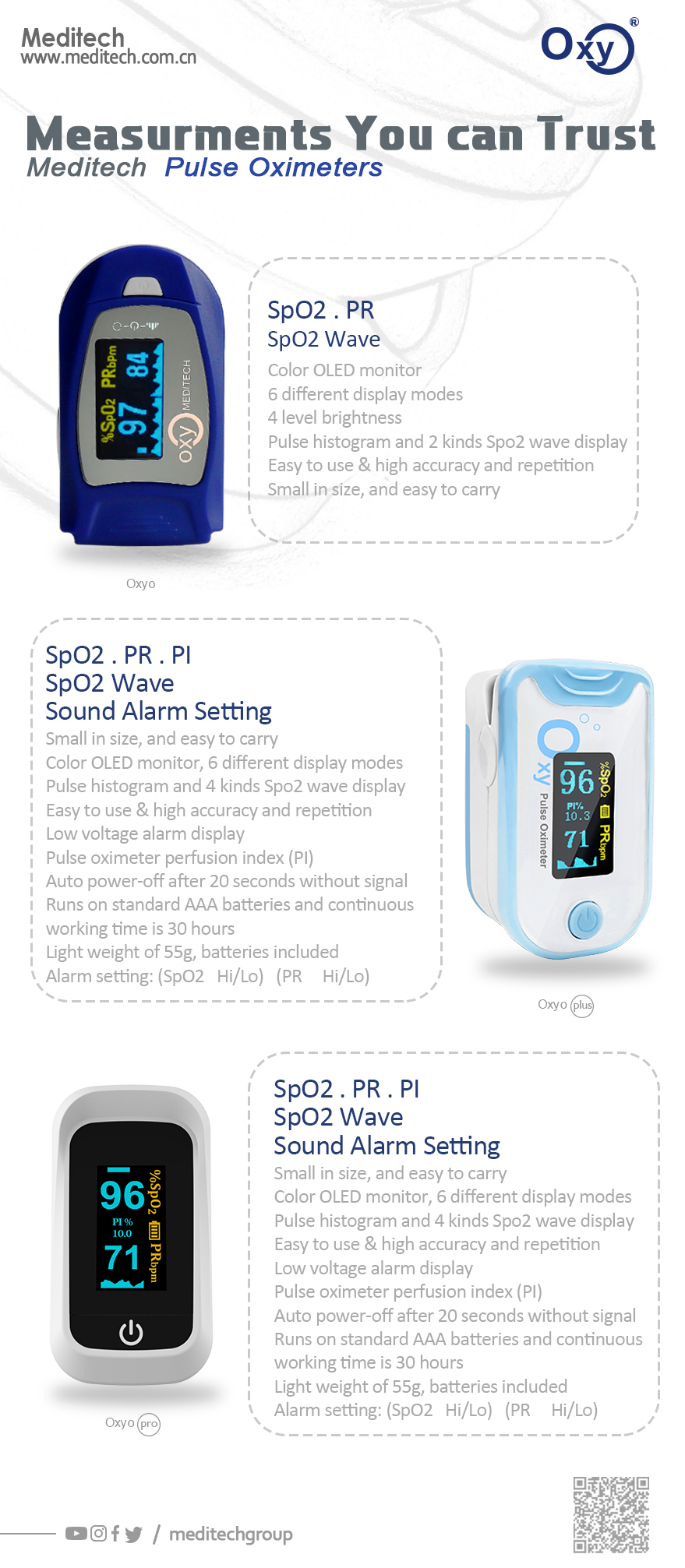 Meditech’s pulse oximeters provide a high level of accuracy of detecting low oxygen levels, making them the medical community’s preferred choice for the current COVID-19 situation where medical professionals need to quickly and accurately assess if a patient is sick. Meditech’s pulse oximeters are also used during treatment to monitor the oxygen levels of critically ill patients with COVID-19 and other severe respiratory illnesses as well as aftercare.