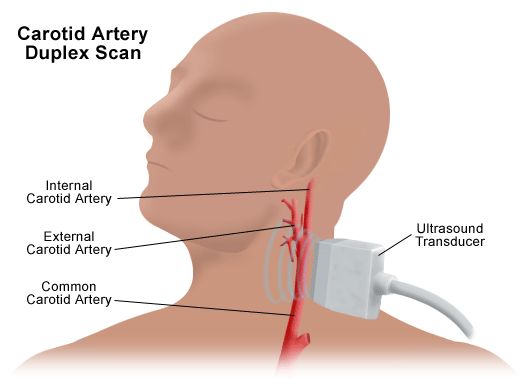 Zur Beurteilung der Halsschlagadern in den Hals, kann eine Karotis-Duplex-Scan durchgeführt werden. Diese Art der Doppler-Untersuchung bietet eine 2-dimensionale (2D) Bild der Arterien, so dass die Struktur der Arterien und Standort einer Okklusion festgestellt werden kann, sowie den Grad der Durchblutung.