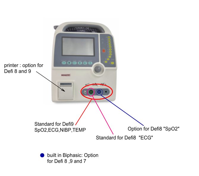 Defi9 Defibrillator monitor have a multi parameters ECG,SpO2,NIBP,TEMP and RESP but Defi8 Have ECG as a standard and SpO2 as an option.