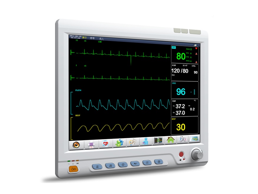 Modular patient monitor 12.1 inch TFT color screen with touch screen. Monitoring ECG, SP02, NIBP, RESP, 2- TEMP, PR as standard parameters, as well as 2-IBP, ETC02 and thermal printer