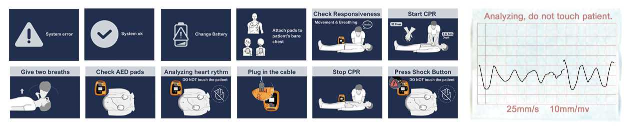 with screen that guides the user step-by-step through the rescue procedure and display of the heart rhythm before shock delivery